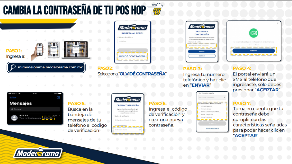 Para que puedas actualizar la contraseña de tu terminal, debes ingresar a tu portal de empresario: https://mimodelorama.modelorama.com.mx/auth/login/